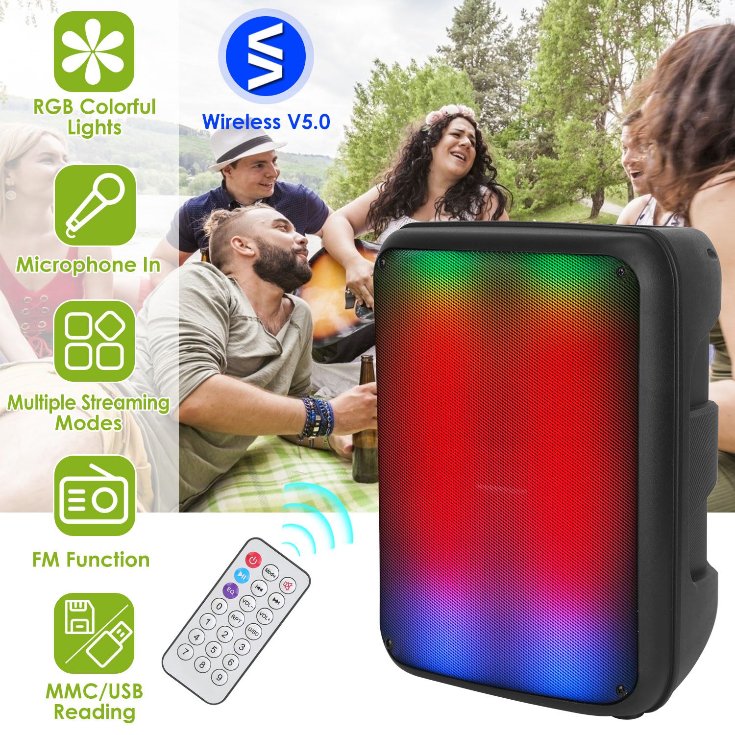 Do you need a wireless speaker for your party? Do you need a speaker for your dancing and karaoke? Do you need a wireless speaker to work out at your home gym? Do you need a wireless speaker to enjoy the carnival with your family or friends? Our wireless party speaker will be the savior of your music. With the built in 8in speaker, mixed with RGB colorful lights, you will experience and encounter the best clarity in vocals and enjoy the wonderful moment. Support AUX line-in connect, MMC/USB Flash Drive music playback, wireless connection, FM searching or remote manual control, battery remain display. Reinforced handles and lightweight speaker are of great mobility.