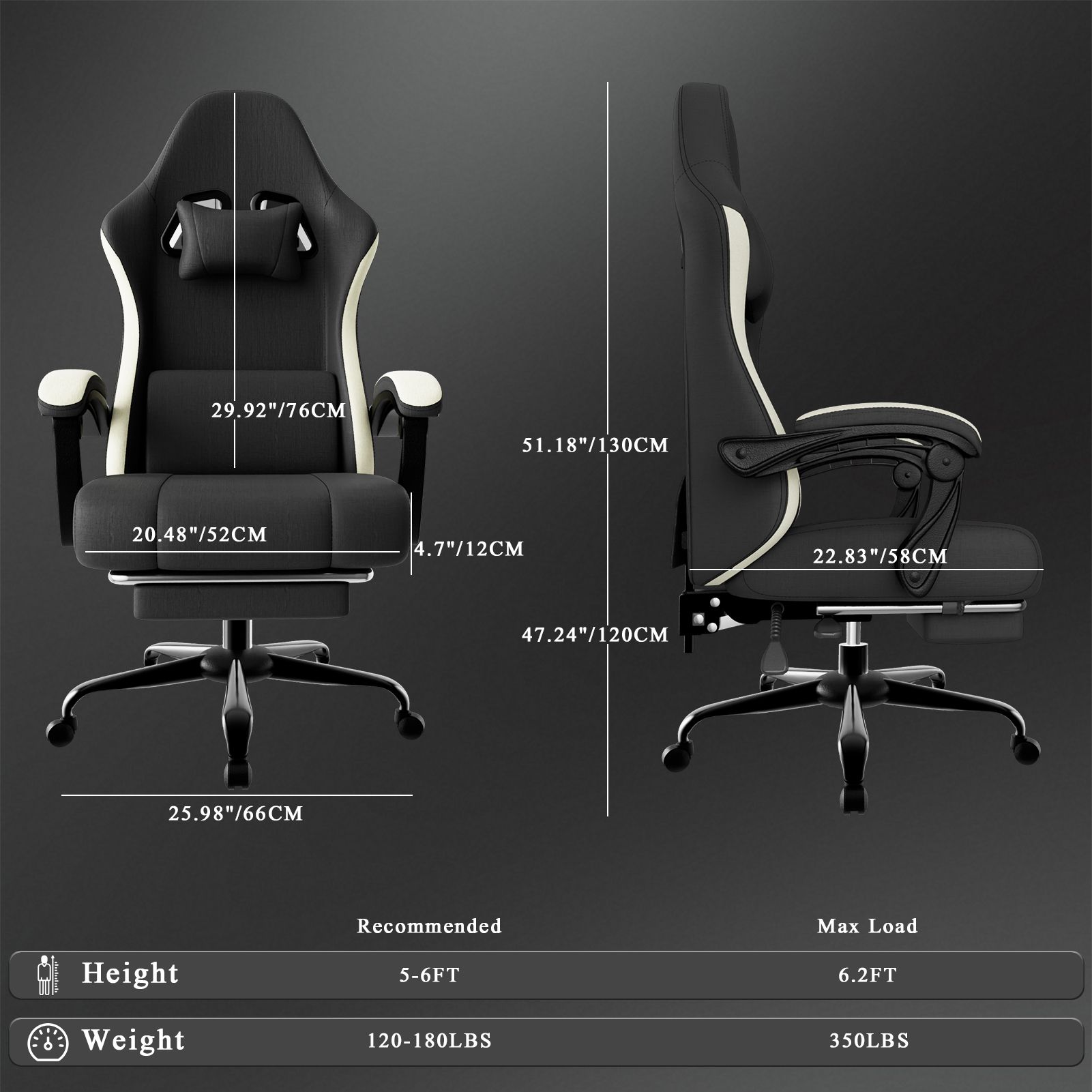 2.Professional Grade Solid Structure:The gaming chair with footrest is made of thickened alloy skeleton to ensure support for heavier users. The SGS-certified Class-4 gas lift allows the office chair to support up to 350 pounds. The BIFMA tested 5-claw metal base with silent rollers that move smoothly without hurting the floor and are stable without shaking, making competitive operations more accurate.