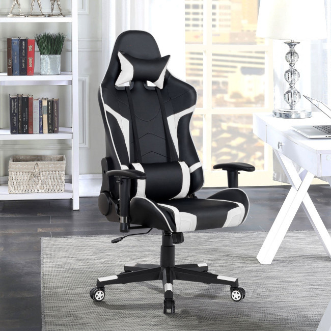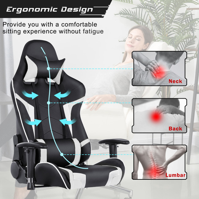 An ergonomic adjustable backrest (90° to 180°) is designed for resting; gaming; working; etc.Back massaging support alleviates pain for greater comfortEasily adjustable seat height to meet different requirementsA high-density cushion ensures structural stability and long-time useFaux leather upholstery for increased softness; excellent durability and breathabilityAdjustable armrest provides soft support for your arms360° swivel chair for convenient maneuverability5-claw base disperses pressure exerted on the chair for increased stabilitySmooth-rolling wheels allow you to move around with easeSuitable for both gamers in the gaming room and workers in the office