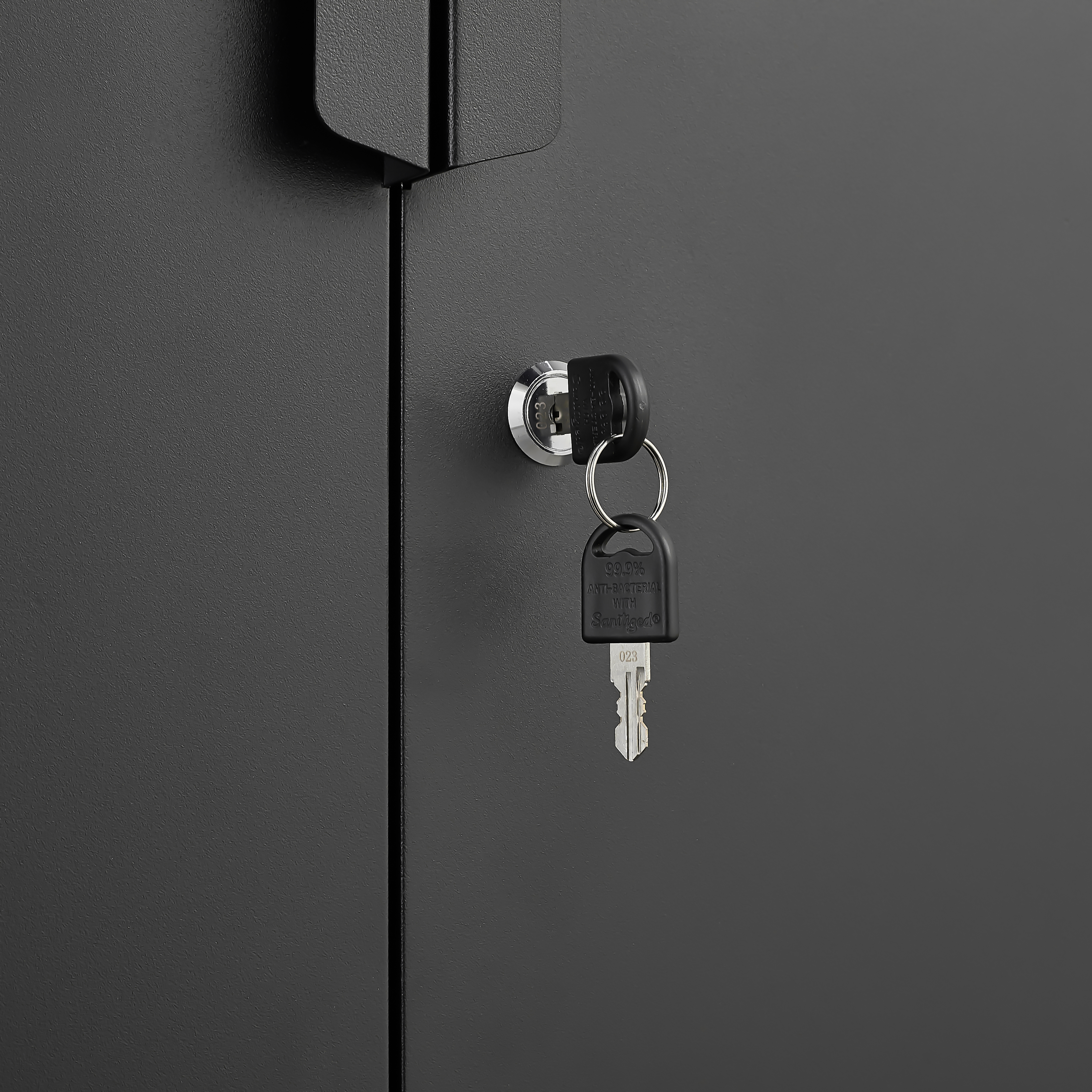 • Equipped with a smooth-gliding metal pull handle and a reliable central locking mechanism. The sturdy lock secures both doors with a single turn, ensuring your confidential documents and valuable items are kept safe and private.