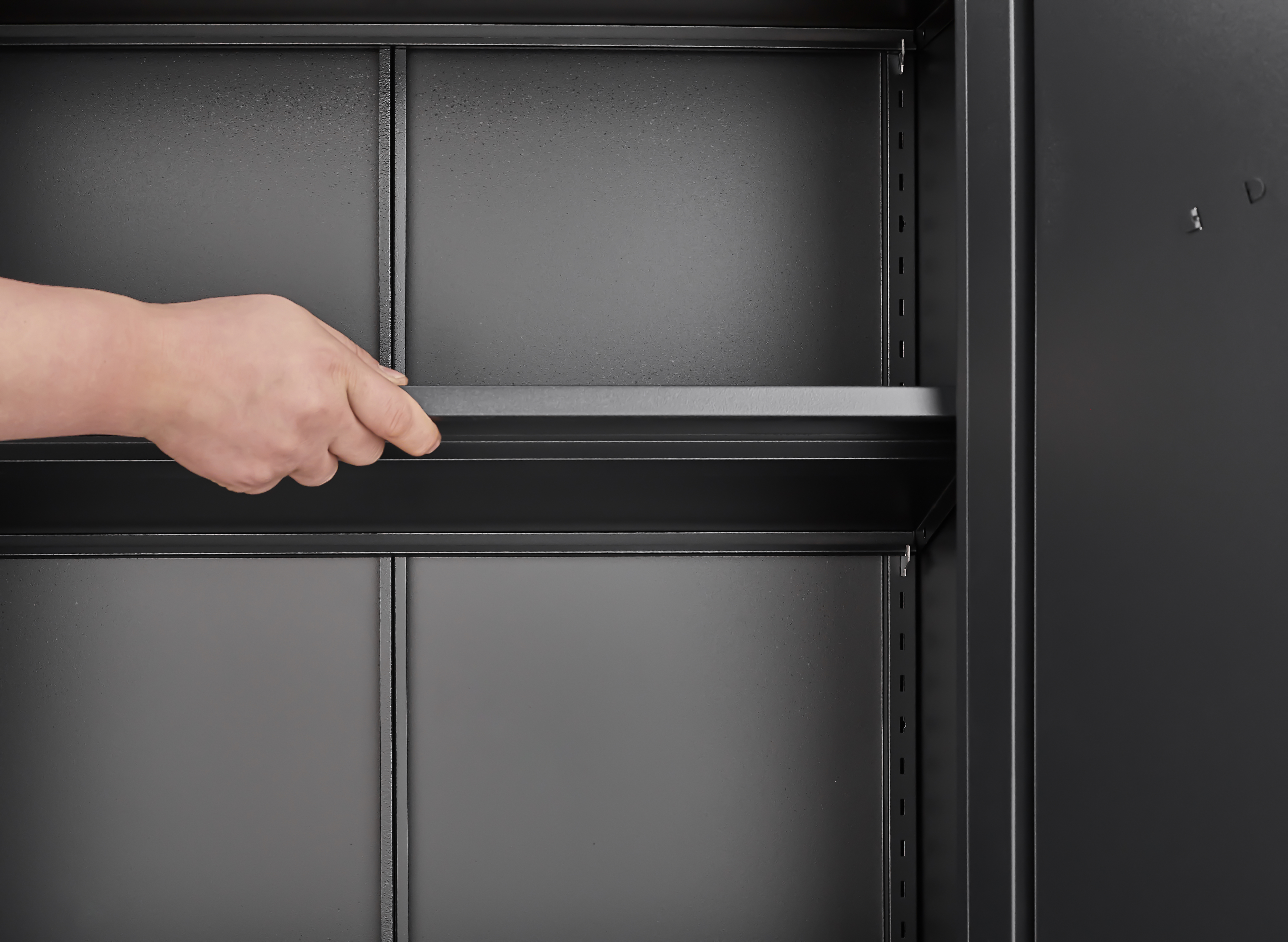 • The storage cabinet for the kitchen pantry is constructed from premium steel that has been treated with powder coating, making it resistant to scratches and corrosion while also being easy to maintain. It features four adjustable shelves, each capable of supporting up to 180 pounds, providing a sturdy and reliable storage solution.